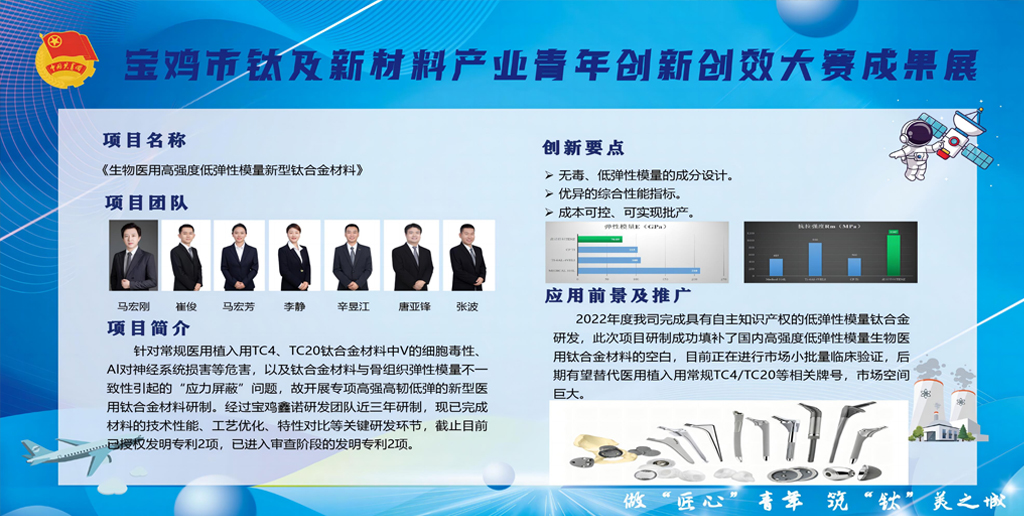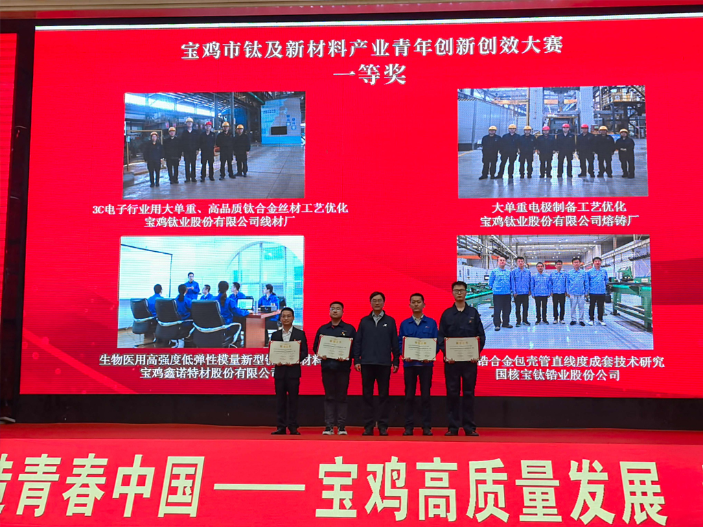 4月29日,寶雞市紀(jì)念五四運(yùn)動105周年暨青春助力“三個年”活動在寶雞萬福酒店舉行。會上,寶雞鑫諾特材股份有限公司《生物醫(yī)用高強(qiáng)度低彈性模量新型鈦合金材料》項(xiàng)目榮獲“寶雞市鈦及新材料產(chǎn)業(yè)青年創(chuàng)新創(chuàng)效大賽”一等獎。
